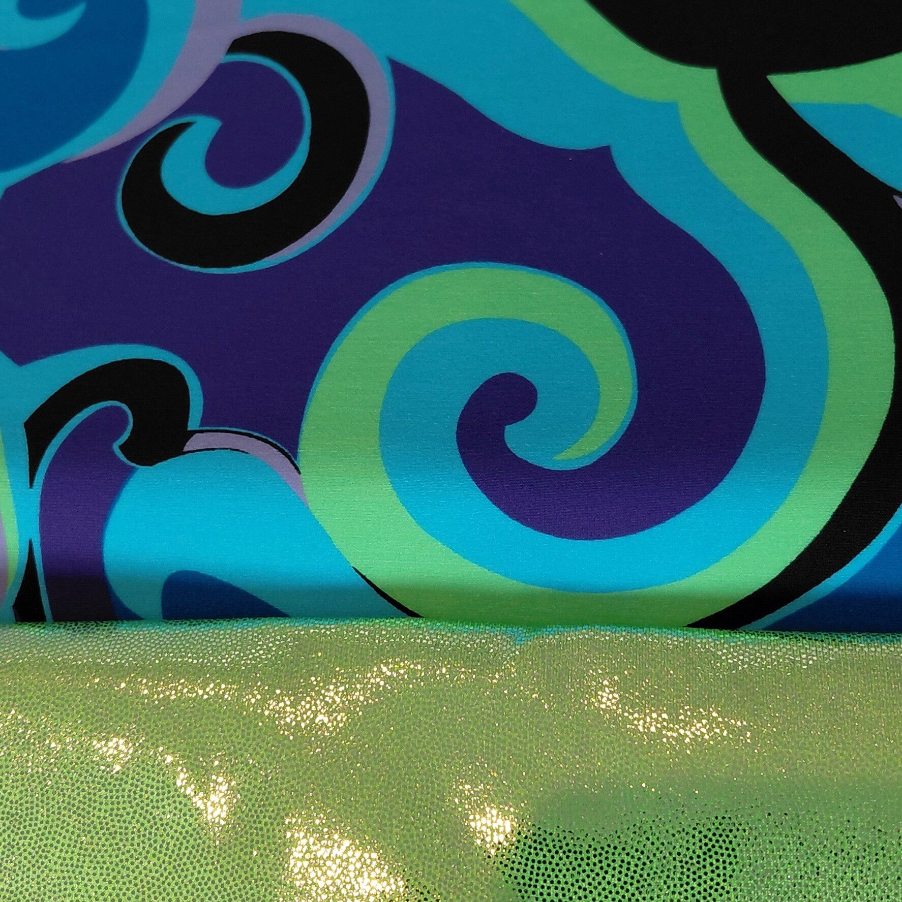 Comfortabel vliegenmasker gemaakt uit lycra met gaas rond ogen en oren. Krullen in groen, lichtblauw en paars op een paarse ondergrond. Neusband in gifgroen.
